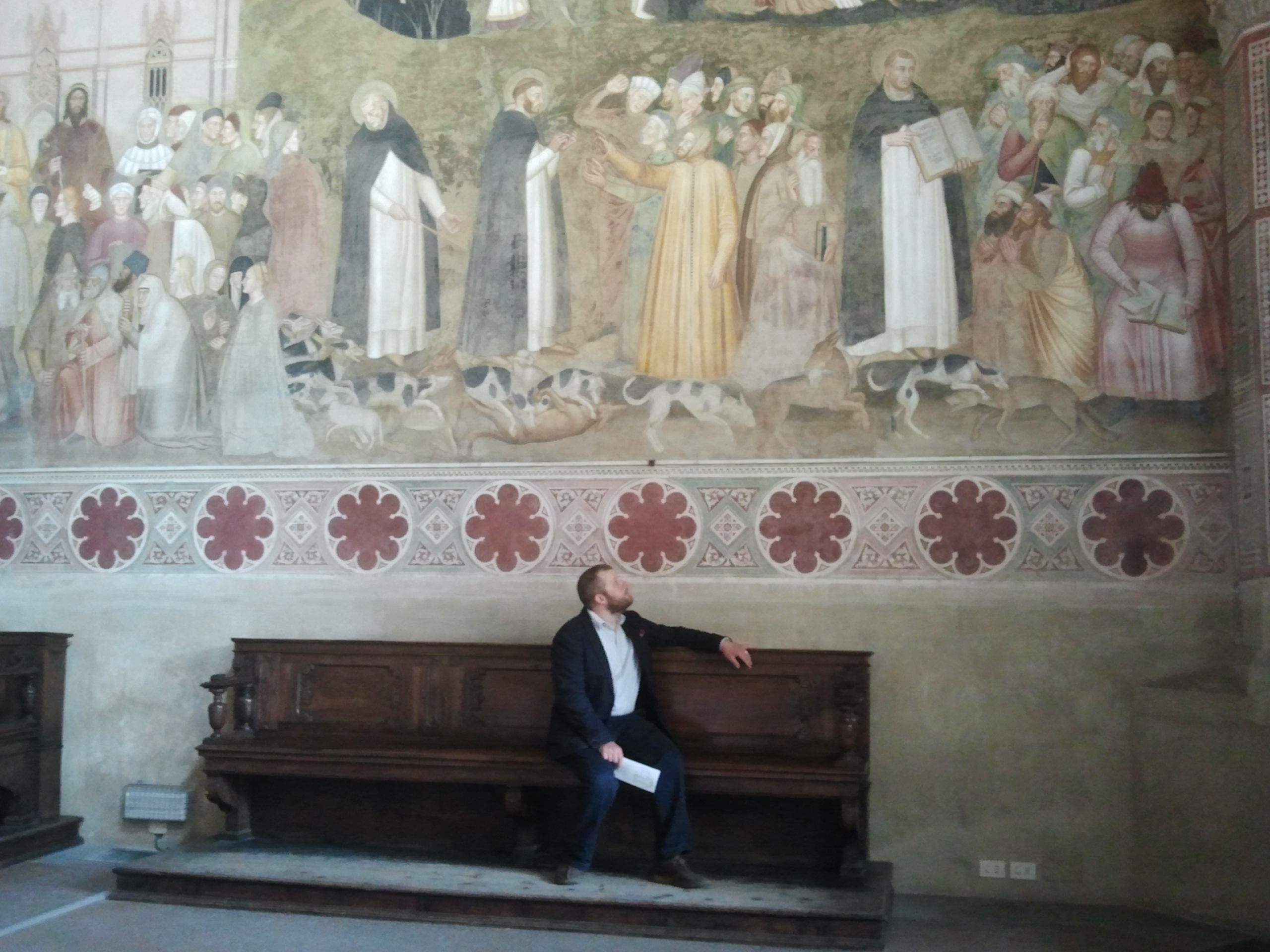 Last weeks I’ve been mostly on the road. I finished both pleasant and productive research period at the Finish Institute in Rome, Villa Lante, in the end of April. Before the next appointment in Munich at the first week of May I was lucky to have few days off and visit Florence – a city which is a must-see for a student of the later Middle Ages. Amongst all Renaissance splendor I was nonetheless very impressed by the frescoes in the Spanish Chapel of Basilica Santa Maria Novella. Painted in the late fourteenth century and depicting Dominican mission and “Church militant” in the world, they have maybe the most impressive presentation of inquisitors and heretics, portrayed both “in person” as well as symbolically. While the Dominican inquisitors preach to heretics, the dogs attack the wolves, alluding not only to a metaphor of heretics as ravening wolves, but also to a medieval pun of friars preachers as domini canes, the dogs of the Lord.