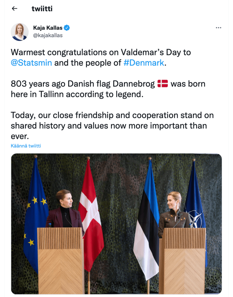 Kaja Kallas, the prime minister of Estonia, congratulated Denmark’s Statsministeriet on Valdemar’s Day, a holiday that since 1913 has been celebrated to commemorate the birth of the Danish flag, the Dannebrog. According to a late medieval legend, the flag descended from the sky when the Danish King Valdemar II Sejr (Victorius) was preparing for a battle against Estonians near present-day Tallinn in 1219. This miracle, so says the legend, led the Danes to an unexpected victory.