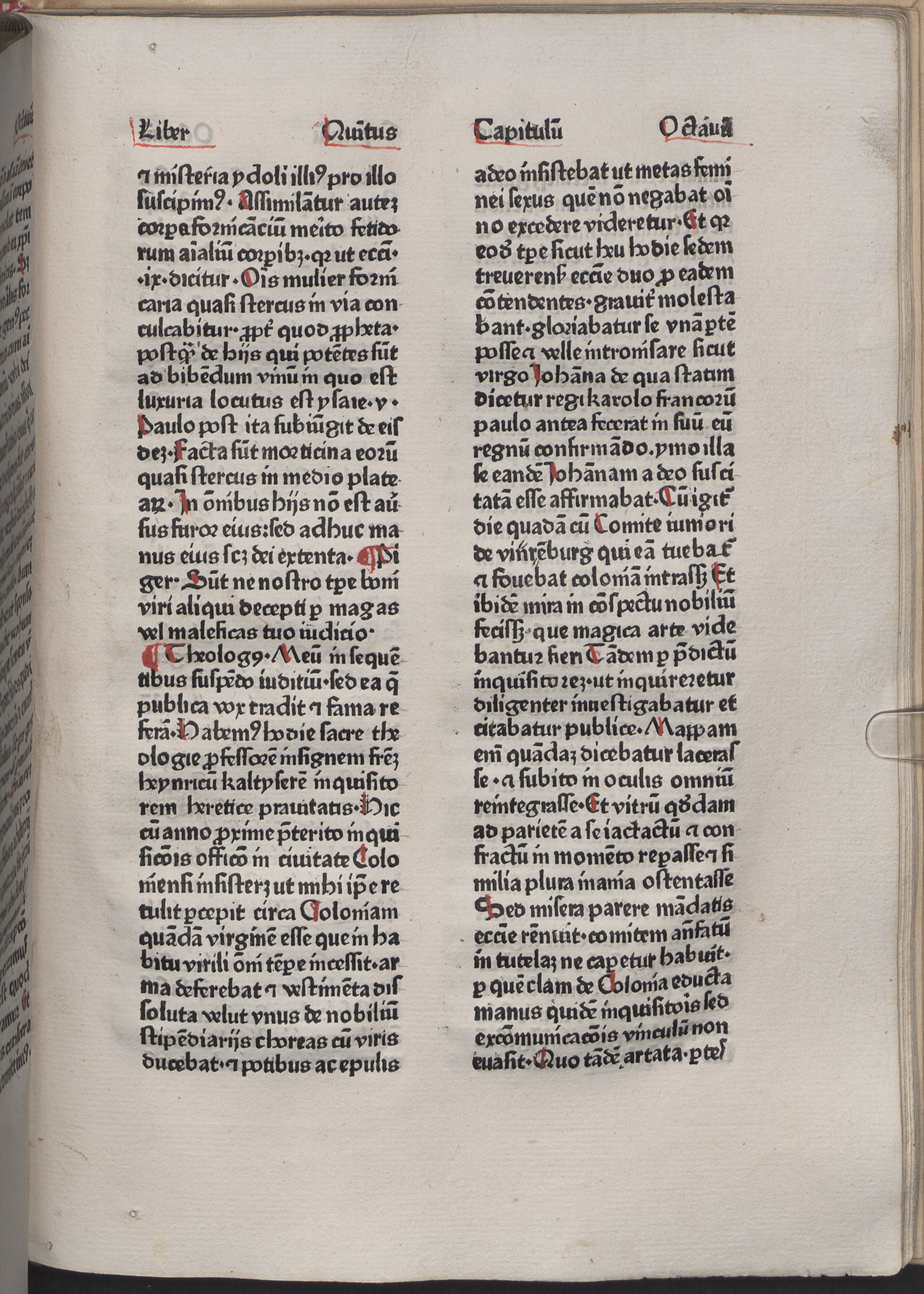 [f. 133r:] Theologus: Meum in sequentibus suspendo iuditium, sed ea que publica vox tradit et fama referam. Habemus hodie sacre theologie professorem insignem fratrem Heynricum Kaltyserem [Kalteisen] inquisitorem heretice prauitatis. Hic cum anno proxime preterito inquisicionis officio in ciuitate Coloniensi insisteret ut mihi ipse retulit, percepit circa Coloniam quandam virginem esse que in habitu virili omni tempore incessit, arma deferebat et vestimenta dissoluta velut unus de nobilium stipendiariis, choreas cum viris ducebat et potibus ac epulis adeo insistebat ut metas feminei sexus quem non negabat ominno excedere videretur. Et quia eodem tempore sicut heu hodie sedem Treverensis ecclesie duo pro eadem contendentes grauiter molestabant, gloriabatur se vnam partem posse et velle intronisare sicut virgo Johanna de qua statim dicetur regi Karolo francorum paolo antea fecerat, in suum eum regnum confirmando, ymo illa se eandem Johannam a Deo suscitatam esse affirmabat. Cum igitur die quadam cum Comite iuniori de Virnenburg qui eam tuebatur et fouebat, Coloniam intrasset. Et ibidem mira in conspectu nobilium fecisset, que magica arte videbantur fieri. Tandem per predictum inquisitorem, ut inquireretur diligenter, inuestigabatur et citabatur publice. Mappam enim quandam dicebatur lacerasse, et subito in oculis omnium reintegrasse. Et vitrum quoddam ad parietem a se iactactum et confractum in momento reparasse et similia plura inania ostentasse. Sed misera parere mandatis ecclesie rennuit, comitem antefatum in tutelam, ne capetur, habuit, per quem clam de Colonia educta manus quidem inquisitoris sed excommunicacionis vinculum non euasit. Quo tandem artata, partes [133v:] Almanie exiuit metasque Gallie intrauit, vbi militem quendam ne ecclesiastico interdicto vexaretur et gladio duxit in matrimonium. Deinde sacerdos quidam, leno vocandus potius, magam hanc verbis deliniuit amatoriis, cum quo postremo furtim recedens metensem ciuitatem intrauit, vbi velut concubina secum habitans, quali spiritu ducta fuerit, cunctis patenter ostendit.